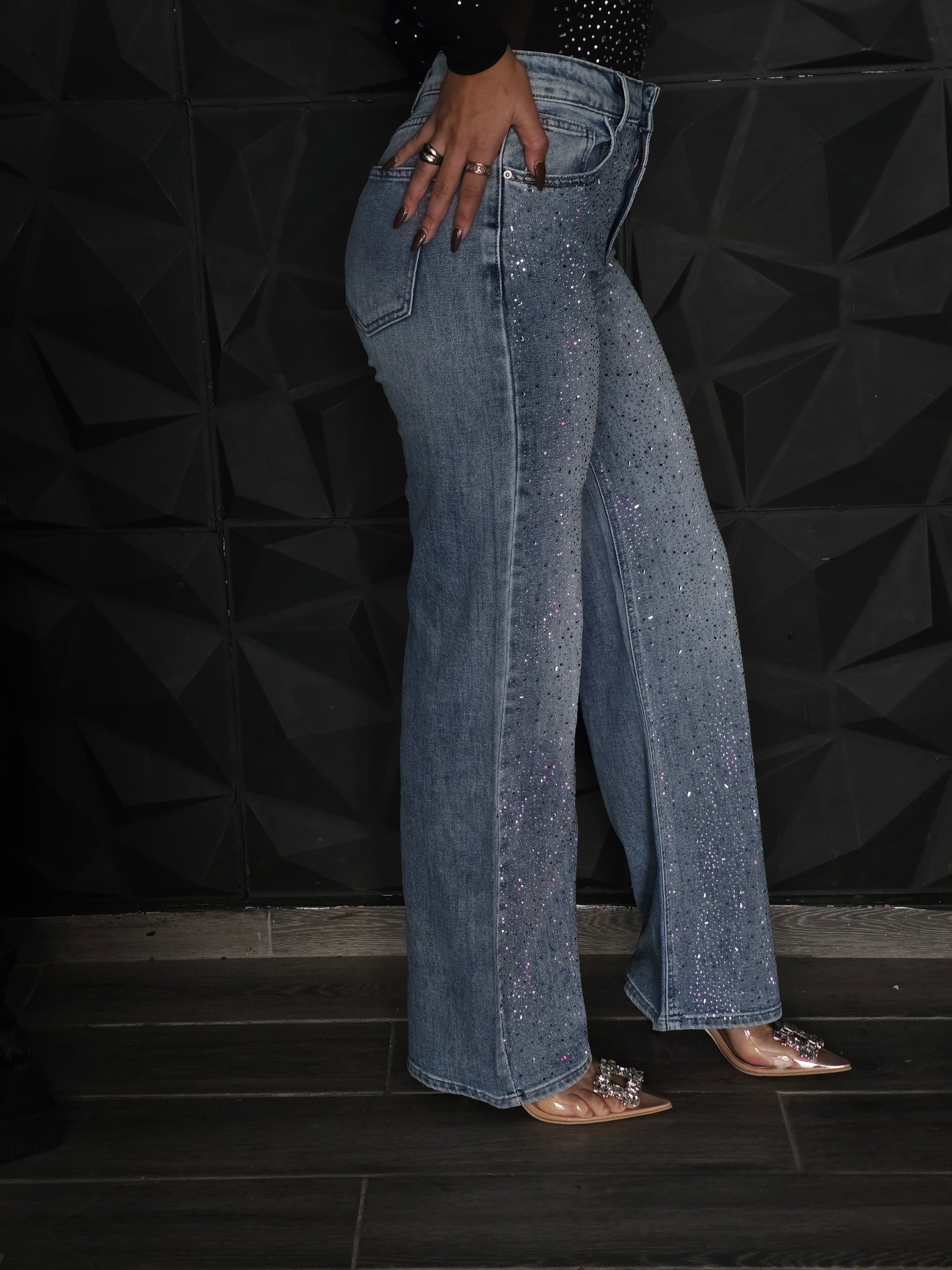 Mahón cintura media alta  Rignstons sólo alfrente  Tela 66.6 % algodón 30% poliester 2.8% viscose 0.6% expandes...
