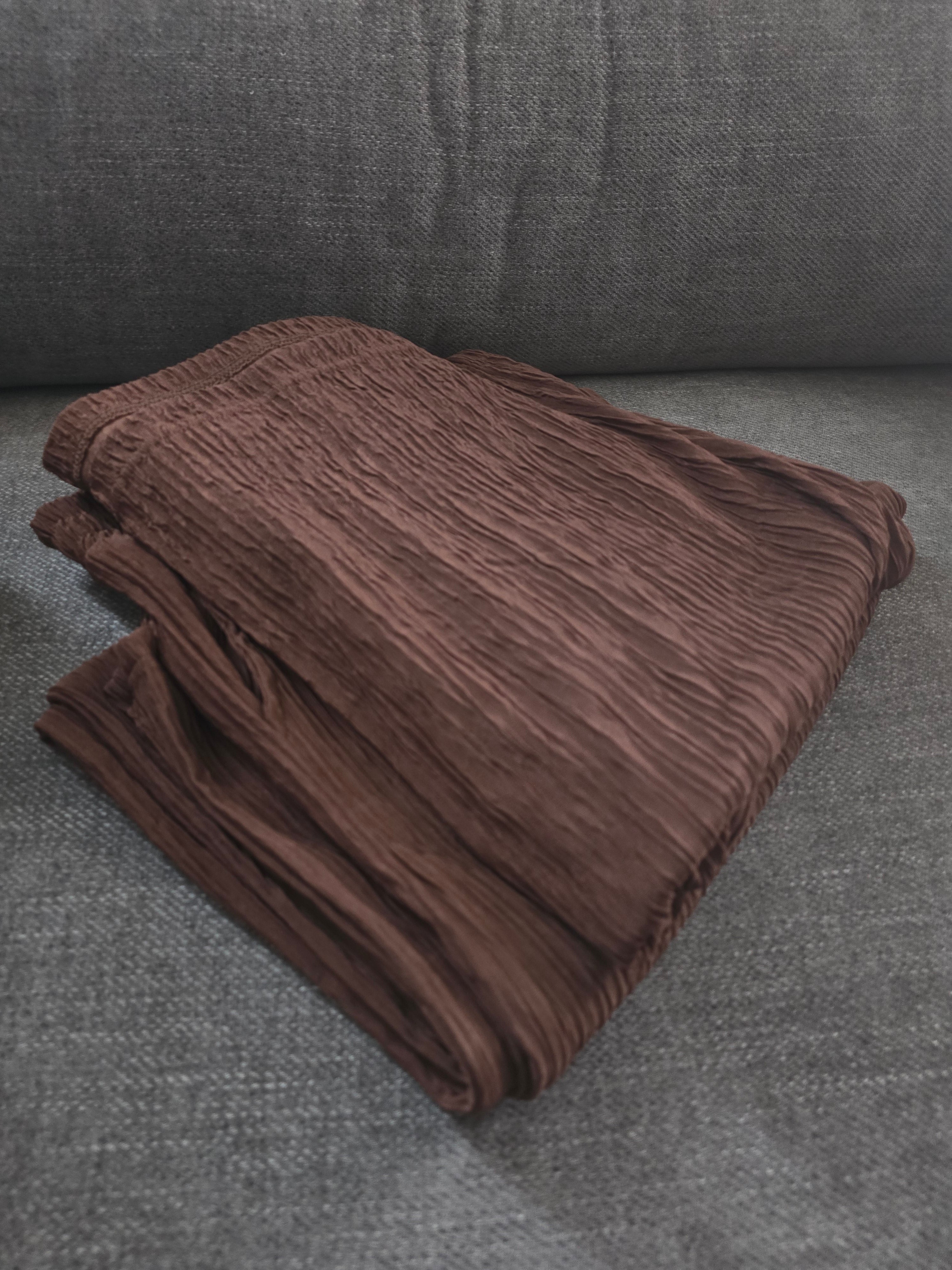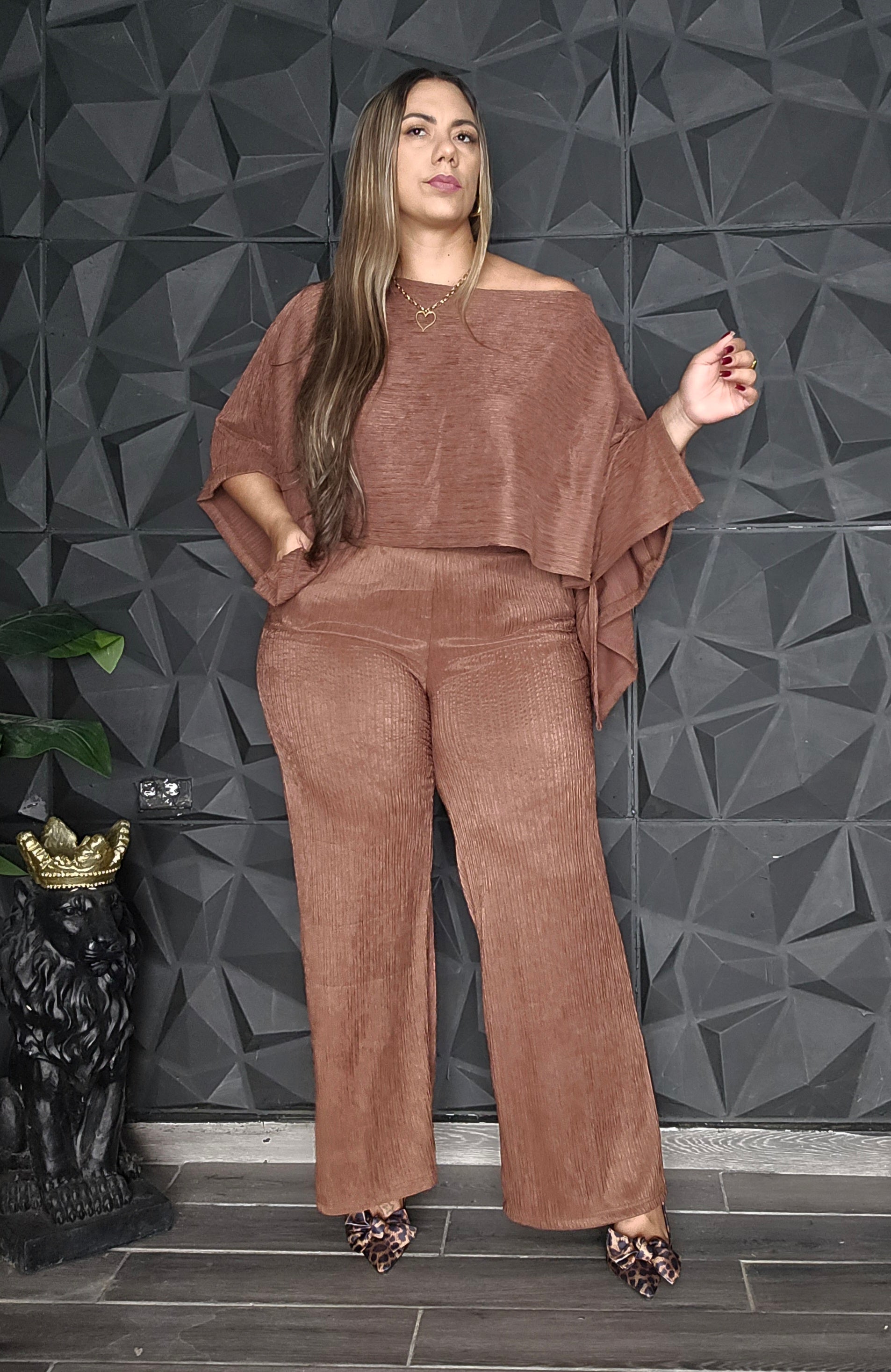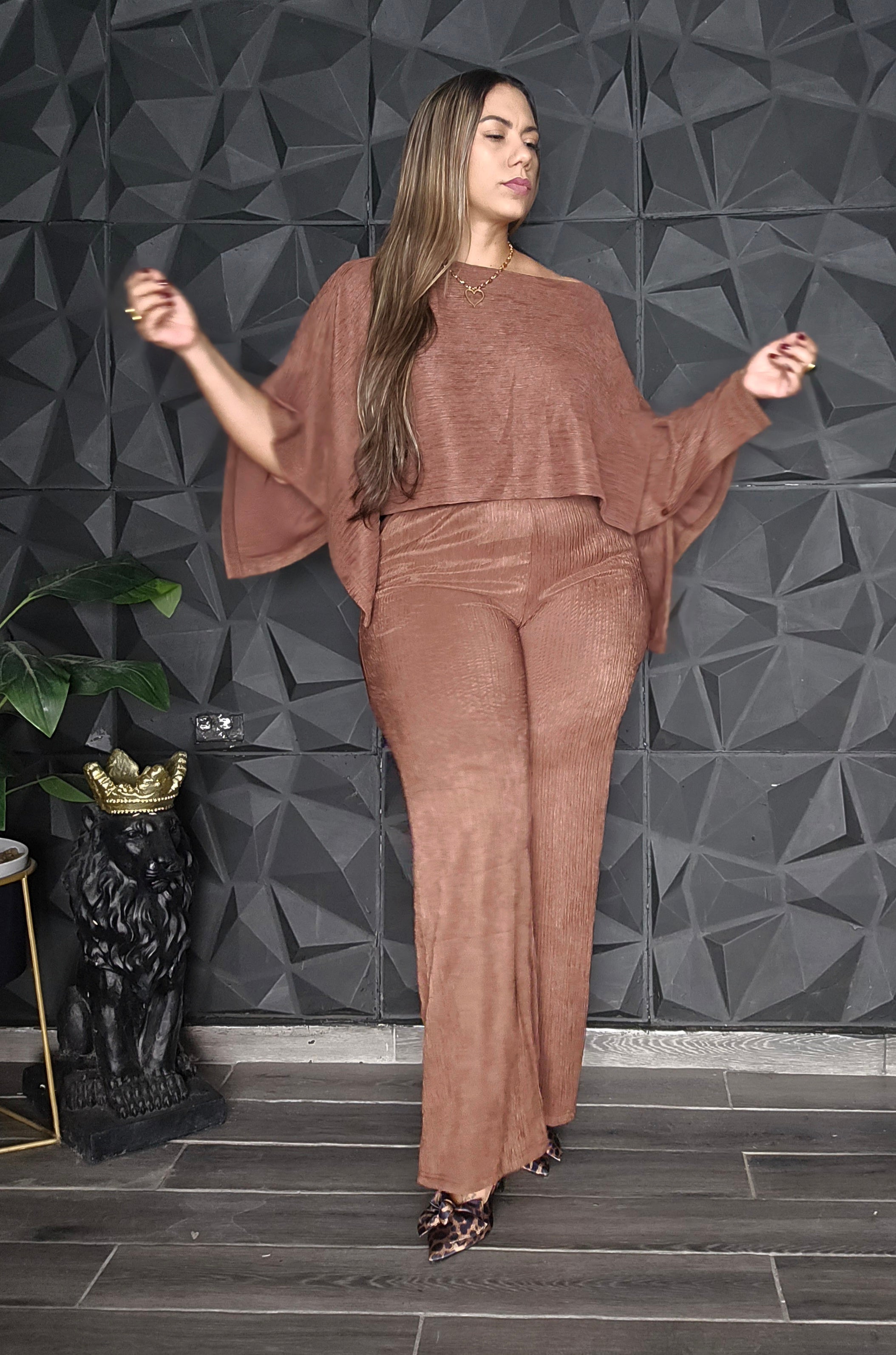Detalles que amarás: Tela texturizada con caída elegante. Top suelto estilo oversized. Pantalón de pierna ancha con cintura cómoda (elástico), bolsillos funcionales. Color chocolate. Conjunto chic y atemporal que puedes usar junto o por separado